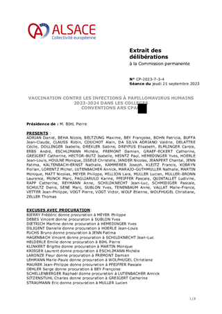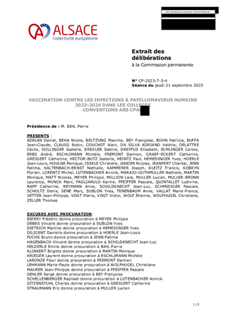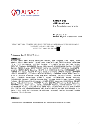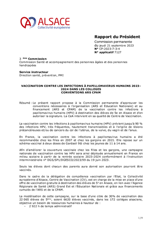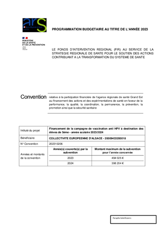 Le présent rapport propose à la Commission permanente d’approuver les conventions nécessaires à l’organisation (ARS et Education Nationale) et au financement (ARS et CPAM) de la vaccination contre les infections à papillomavirus humains (HPV) à destination des élèves de 5e en Alsace et d’en autoriser la signature. La CeA intervient en sa qualité de Centre de Vaccination.