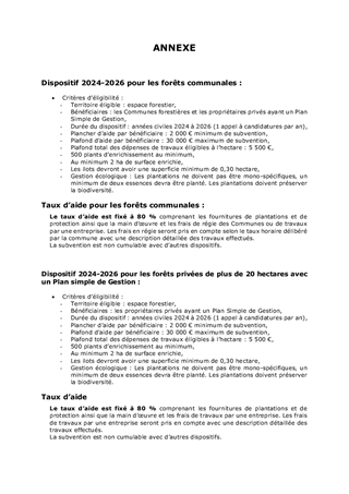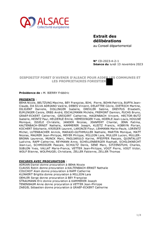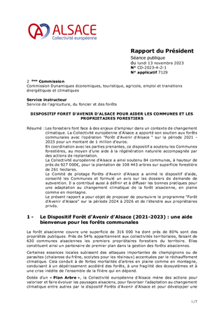 Les forestiers font face à des enjeux d’ampleur dans un contexte de changement climatique. La Collectivité européenne d’Alsace a apporté son soutien aux forêts communales avec l'opération "Forêt d’Avenir d’Alsace " sur la période 2021 - 2023 pour un montant de 1 million d’euros. En coordination avec les parties prenantes, ce dispositif a soutenu les Communes forestières, au moyen d'une aide à la régénération naturelle accompagnée par des actions de replantation. La Collectivité européenne d'Alsace a ainsi soutenu 84 communes, à hauteur de près de 927 000€, pour la plantation de 108 443 arbres sur superficie forestière de 261 hectares. Le Comité de pilotage Forêts d’Avenir d’Alsace a animé le dispositif d’aide, conseillé les Communes et formulé un avis sur les dossiers de demande de subvention. Il a contribué aussi à définir et à diffuser les bonnes pratiques pour une adaptation au changement climatique de la forêt alsacienne, en plaine comme en montagne. Le présent rapport a pour objet de proposer de poursuivre le programme "Forêt d'Avenir d'Alsace" sur la période 2024 à 2026 et de l’étendre aux propriétaires privés.