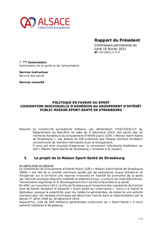 La Collectivité européenne d’Alsace, par délibération n°CD/2019/117 du Département du Bas-Rhin en date du 9 décembre 2019, fait partie des 16 membres fondateurs du Groupement d’intérêt public (GIP) « Maison Sport-Santé de Strasbourg ». Les statuts du GIP prévoient que chaque membre fondateur conventionne de manière individuelle avec le Groupement. Il vous est ainsi proposé d'approuver la convention individuelle d’adhésion au GIP « Maison Sport-Santé de Strasbourg » annexée à ce rapport.