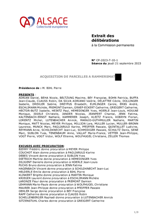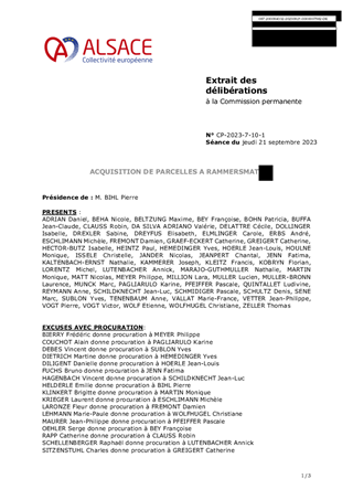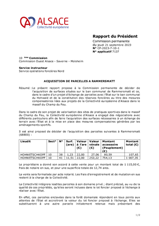 Le présent rapport propose à la Commission permanente de décider de l’acquisition de surfaces situées sur le ban communal de Rammersmatt et ce, dans le cadre d’un projet d’échange de parcelles avec l’Etat sur le ban communal du Hohwald et de la constitution des réserves foncières au titre des mesures compensatoires liées aux projets de la Collectivité européenne d'Alsace dans le massif du Champ du Feu.