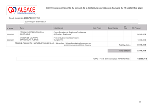 La Collectivité européenne d'Alsace est fortement engagée dans la défense de l’ambition que porte Strasbourg en tant que capitale européenne, à la fois siège des institutions européennes, cœur historique et politique de l’Europe et ville internationale des droits de l’Homme, et plus globalement engagée dans le rayonnement de l'Alsace en Europe et la promotion des valeurs européennes et humanistes en Alsace. Dans le cadre du 14ème Contrat Triennal Strasbourg Capitale Européenne 2021-2023, les signataires (Préfecture, Région Grand Est, Collectivité européenne d’Alsace, Eurométropole et Ville de Strasbourg) ont souhaité créer trois fonds de soutien et un dispositif ad hoc fonctionnant sur un système d'appels à projets, aux côtés du soutien à un ensemble de projets structurants visant à améliorer l’accessibilité multimodale de Strasbourg et à renforcer l’attractivité européenne et internationale de la capitale alsacienne. Ce rapport propose d'attribuer des subventions de fonctionnement aux projets retenus, notamment dans le cadre du système d'appels à projets, pour un montant total de 361 500 €. Il propose aussi d’approuver les termes de l’avenant à la convention annexée à la délibération n°CP-2022-10-6-3 de la Commission Permanente du Conseil de la Collectivité européenne d’Alsace du 14 novembre 2022 portant attribution d’une subvention à l’Université de Strasbourg pour le projet « EUCOR – Le Campus européen : Actions de développement de la vie étudiante et de la mobilité transfrontalière », afin de modifier le calendrier de paiement établi par la convention. Ainsi, à l'issue du vote le taux d'exécution des engagements de la Collectivité européenne d'Alsace dans le cadre du Contrat triennal sera de 43%, avec 6 051 503 € exécutés sur un montant contractualisé de 14 046 000 €.