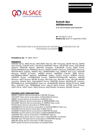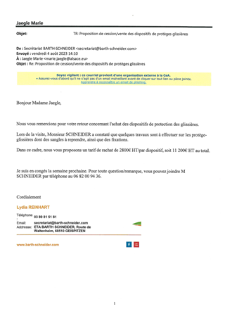 Le présent rapport a pour objet de proposer l’aliénation de quatre dispositifs de protection de glissières de sécurité à la Société BARTH-SCHNEIDER à GEISPITZEN, spécialisée dans les travaux agricoles, forestiers et ruraux, actuellement entreposés au Centre d’Entretien et d’Intervention de BURNHAUPT.