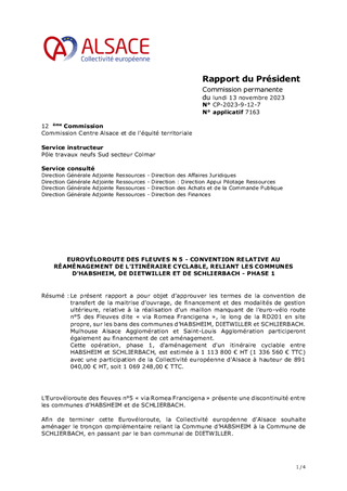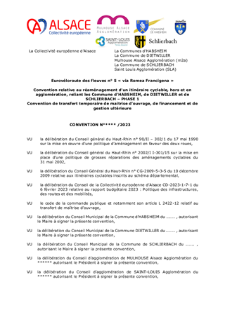Le présent rapport a pour objet d’approuver les termes de la convention de transfert de la maitrise d’ouvrage, de financement et des modalités de gestion ultérieure, relative à la réalisation d’un maillon manquant de l’euro-vélo route n°5 des Fleuves dite « via Romea Francigena », le long de la RD201 en site propre, sur les bans des communes d’HABSHEIM, DIETWILLER et SCHLIERBACH. Mulhouse Alsace Agglomération et Saint-Louis Agglomération participeront également au financement de cet aménagement. Cette opération, phase 1, d'aménagement d'un itinéraire cyclable entre HABSHEIM et SCHLIERBACH, est estimée à 1 113 800 € HT (1 336 560 € TTC) avec une participation de la Collectivité européenne d'Alsace à hauteur de 891 040,00 € HT, soit 1 069 248,00 € TTC.