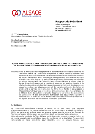 Avec la stratégie d’accompagnement et de contractualisation et les Contrats de Territoire Alsace, la Collectivité européenne d'Alsace souhaite impulser une dynamique de coopération et de partenariats qui renforcent la résilience autour de projets fédérateurs à fort potentiel de développement pour chaque territoire d’action. Pour faire face aux grands défis énergétiques, écologiques, de cohésion sociale et d’attractivité, la Collectivité européenne d'Alsace a mis en place le Fonds Attractivité Alsace qui a vocation à apporter un soutien financier à la réalisation de projets qui répondent aux enjeux des territoires, à des besoins non couverts, porteurs de développement et de transformation des territoires et améliorent le service public alsacien. Au titre de ce fonds, il est proposé à l’Assemblée d’attribuer des subventions d’investissement d’un montant total de 2 338 233 € afin de soutenir 12 projets, d’approuver les termes des conventions de partenariat et des conventions d’utilisation des équipements sportifs à conclure dans le cadre du Fonds Attractivité Alsace et d’autoriser le Président à les signer, ainsi que les conventions financières y afférant.