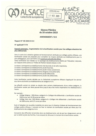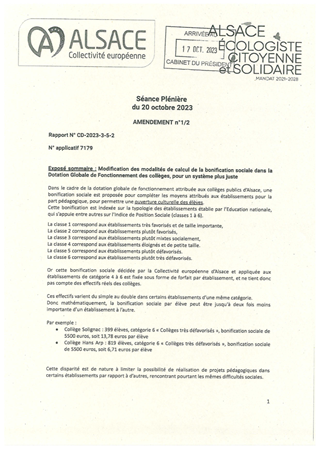 La Collectivité européenne d’Alsace est la 2e collectivité de France par le nombre de collèges publics : elle gère 147 établissements et alloue chaque année 183 M€ à la réussite éducative. Une nouvelle dotation globale de fonctionnement (DGF), harmonisée à l’échelle de l’ensemble des collèges alsaciens, mise en œuvre au 1er janvier 2023, constitue le premier acte d’une politique permettant de mieux répondre aux besoins des établissements et à l’ambition portée par la Collectivité. La Collectivité a poursuivi les démarches d’harmonisation. Depuis septembre 2023, la gestion de la fourniture des équipements de protection individuelle (EPI) et des vêtements de travail des agents techniques des collèges est internalisée. Un nouveau dispositif, adopté par le Conseil en juin 2023, visant à prendre en charge les frais liés aux visites des lieux de mémoire alsaciens et nationaux entre en vigueur à compter de la rentrée scolaire 2023-2024. L’année 2023 a été particulièrement marquée par la hausse du prix des énergies qui a conduit la Collectivité à verser aux collèges publics un deuxième bouclier énergétique en juin 2023 d’un montant de 10,4 M € et des dotations de fonctionnement complémentaires au long cours attribuées pour couvrir le surcoût des dépenses d’énergie 2022 et 2023 pour un montant total de 5,3 M€. Les dépenses de viabilisation des collèges publics s’élèvent ainsi d’ores et déjà à 38,7 M € pour l’année 2023. Par ailleurs, la Collectivité poursuit ses efforts de modernisation et d’amélioration des performances énergétiques des collèges et va restructurer ou rénover un collège sur trois, en améliorant leurs performances énergétiques. Les nouveaux collèges en construction visent des niveaux de haute performance énergétique comme le collège d’Eckbolsheim qui sera basse consommation et à énergie positive. La Collectivité promeut également le raccordement des collèges aux réseaux de chaleurs biomasse qui se développent sur tout le territoire Alsacien tout en continuant le déploiement d’installation photovoltaïques sur les toitures des collèges publics (17 M€). Les collèges sont accompagnés dans les efforts de maîtrise de l’énergie au travers d’investissement ciblé, de sessions de formation dédiées au bénéfice des agents de maintenance et de sensibilisation des éco-délégués, offrant ainsi un accompagnement à 360°. L’action de la Collectivité partagée avec la communauté éducative des établissements a permis de réaliser 35 % d’économie d’énergie dont 24 % grâce à l’action des collèges. Ce sont ainsi près de 3,9 M€ d’économies réalisées sur les factures de chauffage des collèges publics. Le Conseil de la Collectivité européenne d'Alsace a décidé de l’attribution d’un bonus énergie en 2023, visant à gratifier les collèges faisant preuve de sobriété énergétique et qui ont réduit leurs consommations énergétiques. 1,2 M € de dotations de fonctionnement complémentaire fléchée (80 % selon les priorités retenues par le collège, 20 % pour l’acquisition d’équipements permettant d’améliorer les conditions de travail des agents techniques du collège (ATC) ont été versées à 120 collèges publics). La dotation globale de fonctionnement, qui représente la principale recette de chaque établissement, doit permettre de financer les dépenses liées à son fonctionnement et doit constituer à ce titre une réponse aux crises actuelles. Le présent rapport a pour objet de présenter les modalités financières de la DGF 2024, des collèges publics alsaciens tenant compte de l’évolution du coût des énergies, en baisse sensible par rapport à l’année 2023, grâce aux marchés et des prix unitaires en forte baisse pour le gaz. Elle sera notifiée avant le 1er novembre à l’ensemble des établissements.
