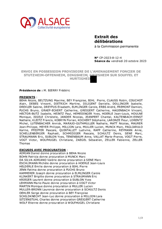 Conformément au Code rural et de la pêche maritime, sur proposition de la Commission Départementale d'Aménagement Foncier du Bas-Rhin, la Commission permanente doit se prononcer sur l’envoi en possession provisoire des nouvelles parcelles de l'opération d'aménagement foncier agricole, forestier et environnemental de STUTZHEIM-OFFENHEIM, DINGSHEIM, GRIESHEIM SUR SOUFFEL et HURTIGHEIM avec extension sur MITTELHAUSBERGEN.