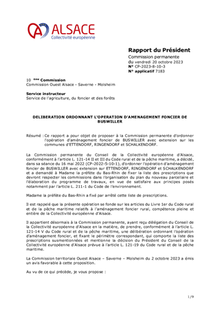 Ce rapport a pour objet de proposer à la Commission permanente d’ordonner l'opération d’aménagement foncier de BUSWILLER avec extension sur les communes d’ETTENDORF, RINGENDORF et SCHALKENDORF.