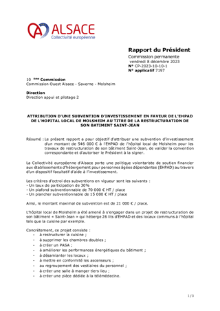 Le présent rapport a pour objectif d'attribuer une subvention d'investissement d'un montant de 546 000 € à l'EHPAD de l'hôpital local de Molsheim pour les travaux de restructuration de son bâtiment Saint-Jean, de valider la convention correspondante et d'autoriser le Président à la signer.