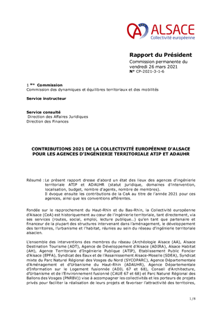 Le présent rapport dresse d'abord un état des lieux des agences d'ingénierie territoriale ATIP et ADAUHR (statut juridique, domaines d'intervention, localisation, budget, nombre d'agents, nombre de membres). Il évoque ensuite les contributions de la CeA au titre de l'année 2021 pour ces agences, ainsi que les conventions afférentes.