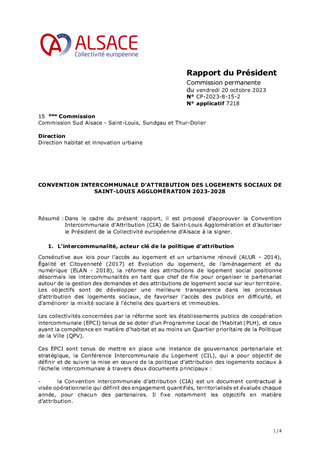 Dans le cadre du présent rapport, il est proposé d’approuver la Convention Intercommunale d’Attribution (CIA) de Saint-Louis Agglomération et d’autoriser le Président de la Collectivité européenne d’Alsace à la signer.