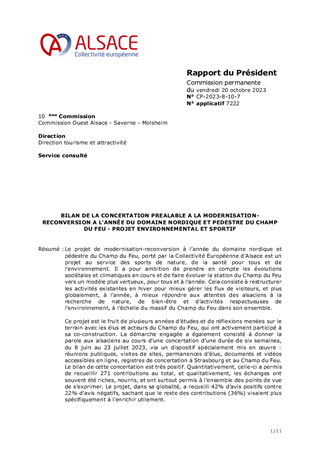 Le projet de modernisation-reconversion à l’année du domaine nordique et pédestre du Champ du Feu, porté par la Collectivité Européenne d’Alsace est un projet au service des sports de nature, de la santé pour tous et de l’environnement. Il a pour ambition de prendre en compte les évolutions sociétales et climatiques en cours et de faire évoluer la station du Champ du Feu vers un modèle plus vertueux, pour tous et à l’année. Cela consiste à restructurer les activités existantes en hiver pour mieux gérer les flux de visiteurs, et plus globalement, à l’année, à mieux répondre aux attentes des alsaciens à la recherche de nature, de bien-être et d’activités respectueuses de l’environnement, à l’échelle du massif du Champ du Feu dans son ensemble. Ce projet est le fruit de plusieurs années d’études et de réflexions menées sur le terrain avec les élus et acteurs du Champ du Feu, qui ont activement participé à sa co-construction. La démarche engagée a également consisté à donner la parole aux alsaciens au cours d'une concertation d’une durée de six semaines, du 8 juin au 23 juillet 2023, via un dispositif spécialement mis en œuvre : réunions publiques, visites de sites, permanences d’élus, documents et vidéos accessibles en ligne, registres de concertation à Strasbourg et au Champ du Feu. Le bilan de cette concertation est très positif. Quantitativement, celle-ci a permis de recueillir 271 contributions au total, et qualitativement, les échanges ont souvent été riches, nourris, et ont surtout permis à l’ensemble des points de vue de s’exprimer. Le projet, dans sa globalité, a recueilli 42% d’avis positifs contre 22% d’avis négatifs, sachant que le reste des contributions (36%) visaient plus spécifiquement à l'enrichir utilement. Le projet porté par la Collectivité Européenne d’Alsace au Champ du Feu a globalement été bien compris et très bien accueilli par les alsaciens. Des besoins en expertises complémentaires, à venir, ont néanmoins été pointées du doigt, concernant la ressource en eau au Champ du Feu, ou le futur modèle économique et de gestion des équipements de la Collectivité Européenne d’Alsace sur site. Au final, le projet a globalement obtenu le « satisfecit » des alsaciens concernant la restructuration des activités existantes, de pleine nature et pour tous, l'amélioration de la gestion des flux de visiteurs à l’année, la transition énergétique des bâtiments actuels et à venir, la désimperméabilisation des sols et la protection de l’environnement. La restructuration du pôle nordique, du site des Bottelets au site des Myrtilles, a été au cœur de nombreuses contributions, positives pour bon nombre d'entre-elles, sachant que beaucoup de contributions ont aussi permis d'exprimer des propositions d'amélioration, des questions complémentaires, des doutes, voire dans certains cas des oppositions franches à la restructuration de cet équipement. Au final toutes ces contributions doivent être prise en compte au projet global avant de poursuivre les procédures engagées. Le présent rapport vise à porter à connaissance de l'assemblée les enseignements de cette concertation, en vue de consolider le projet porté par la Collectivité Européenne d'Alsace au Champ du Feu, après l’avoir requestionné sur certains de ses aspects et après avoir produit les expertises complémentaires jugées nécessaires. Une enquête publique, à venir courant 2024, permettra de saisir à nouveau l’avis des alsaciens, sur la base d’un projet qui a aura pu évoluer au cours des prochaines semaines.