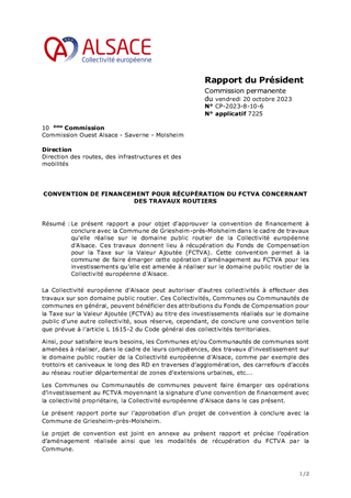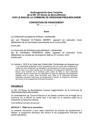 Le présent rapport a pour objet d’approuver la convention de financement à conclure avec la Commune de Griesheim-près-Molsheim dans le cadre de travaux qu'elle réalise sur le domaine public routier de la Collectivité européenne d’Alsace. Ces travaux donnent lieu à récupération du Fonds de Compensation pour la Taxe sur la Valeur Ajoutée (FCTVA). Cette convention permet à la commune de faire émarger cette opération d’aménagement au FCTVA pour les investissements qu’elle est amenée à réaliser sur le domaine public routier de la Collectivité européenne d’Alsace.