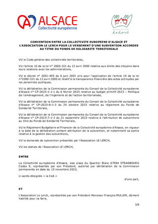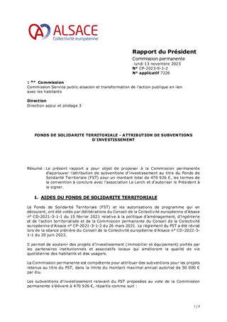 Le présent rapport a pour objet de proposer à la Commission permanente d'approuver l'attribution de subventions d'investissement au titre du Fonds de Solidarité Territoriale (FST) pour un montant total de 470 926 €, les termes de la convention à conclure avec l'association Le Lerch et d’autoriser le Président à la signer.