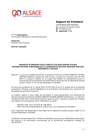 Il vous est proposé d’accorder la garantie d'emprunt à POLE HABITAT COLMAR CENTRE ALSACE à hauteur de 100 % pour un prêt d’un montant total de 661 000 € à souscrire auprès de la Caisse des Dépôts et Consignations pour le financement d'une opération de réhabilitation thermique de 24 logements locatifs sociaux situés 17-19 rue des Mésanges à COLMAR.