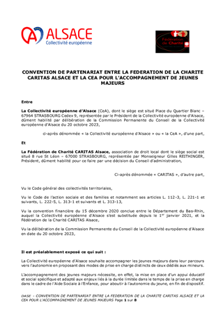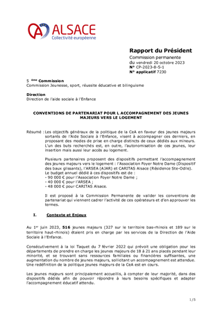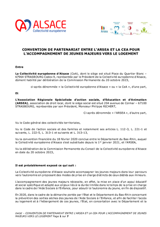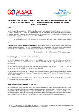 Les objectifs généraux de la politique de la CeA en faveur des jeunes majeurs sortants de l’Aide Sociale à l’Enfance, visent à accompagner ces derniers, en proposant des modes de prise en charge distincts de ceux dédiés aux mineurs. L’un des buts recherchés est, en outre, l’autonomisation de ces jeunes, leur insertion mais aussi leur accès au logement. Plusieurs partenaires proposent des dispositifs permettant l’accompagnement des jeunes majeurs vers le logement : l’Association Foyer Notre Dame (Dispositif des baux glissants), l’ARSEA (AJAR) et CARITAS Alsace (Résidence Ste-Odile). Le budget annuel dédié à ces dispositifs est de : - 90 000 € pour l’Association Foyer Notre Dame ; - 40 000 € pour l’ARSEA ; - 48 000 € pour CARITAS Alsace. Il est proposé à la Commission Permanente de valider les conventions de partenariat qui viennent cadrer l’activité de ces opérateurs et d’en approuver les termes.