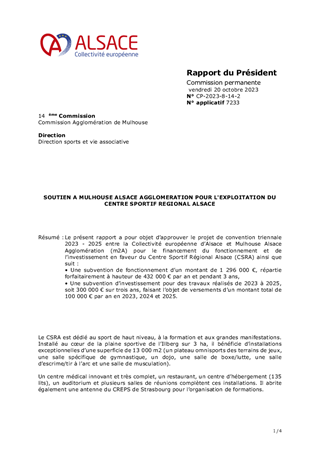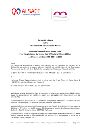 Le présent rapport a pour objet d’approuver le projet de convention triennale 2023 - 2025 entre la Collectivité européenne d’Alsace et Mulhouse Alsace Agglomération (m2A) pour le financement du fonctionnement et de l’investissement en faveur du Centre Sportif Régional Alsace (CSRA) ainsi que suit : • Une subvention de fonctionnement d’un montant de 1 296 000 €, répartie forfaitairement à hauteur de 432 000 € par an et pendant 3 ans, • Une subvention d’investissement pour des travaux réalisés de 2023 à 2025, soit 300 000 € sur trois ans, faisant l’objet de versements d’un montant total de 100 000 € par an en 2023, 2024 et 2025.