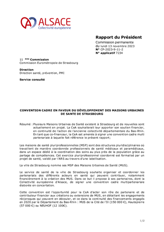 Plusieurs Maisons Urbaines de Santé existent à Strasbourg et de nouvelles sont actuellement en projet. La CeA souhaiterait leur apporter son soutien financier, en continuité de l'action de l'ancienne collectivité départementale du Bas-Rhin. En tant que co-financeur, la CeA est amenée à signer une convention cadre multi partenariale à laquelle fait référence le présent rapport;