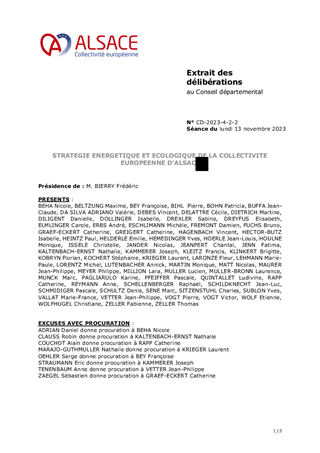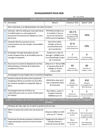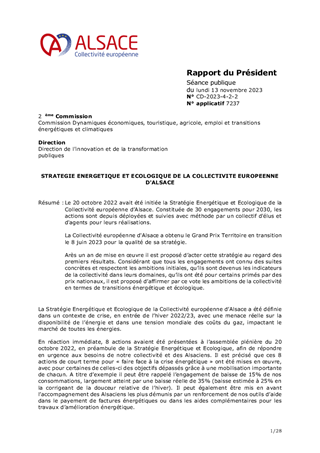 Le 20 octobre 2022 avait été initiée la Stratégie Energétique et Ecologique de la Collectivité européenne d’Alsace. Constituée de 30 engagements pour 2030, les actions sont depuis déployées et suivies avec méthode par un collectif d'élus et d'agents pour leurs réalisations. La Collectivité européenne d'Alsace a obtenu le Grand Prix Territoire en transition le 8 juin 2023 pour la qualité de sa stratégie. Arès un an de mise en œuvre il est proposé d’acter cette stratégie au regard des premiers résultats. Considérant que tous les engagements ont connu des suites concrètes et respectent les ambitions initiales, qu’ils sont devenus les indicateurs de la collectivité dans leurs domaines, qu’ils ont été pour certains primés par des prix nationaux, il est proposé d’affirmer par ce vote les ambitions de la collectivité en termes de transitions énergétique et écologique.