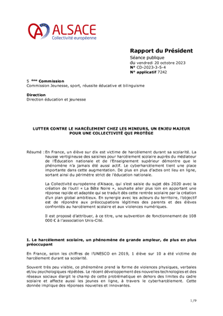 En France, un élève sur dix est victime de harcèlement durant sa scolarité. La hausse vertigineuse des saisines pour harcèlement scolaire auprès du médiateur de l’Éducation nationale et de l’Enseignement supérieur démontre que le phénomène n’a jamais été aussi actif. Le cyberharcèlement tient une place importante dans cette augmentation. De plus en plus d’actes ont lieu en ligne, sortant ainsi du périmètre strict de l’éducation nationale. La Collectivité européenne d’Alsace, qui s’est saisie du sujet dès 2020 avec la création de l’outil « La Bête Noire », souhaite aller plus loin en apportant une réponse rapide et adaptée qui se traduit dès cette rentrée scolaire par la création d’un plan global ambitieux. En synergie avec les acteurs du territoire, l’objectif est de répondre aux préoccupations légitimes des parents et des élèves confrontés au harcèlement scolaire et aux violences numériques. Il est proposé d’attribuer, à ce titre, une subvention de fonctionnement de 108 000 € à l’association Unis-Cité.