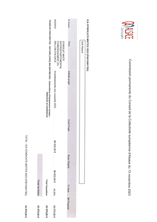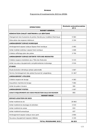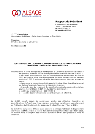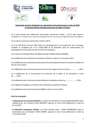Dans le cadre de la politique montagne de la Collectivité européenne d'Alsace, il est proposé, en faveur du SM Interdépartemental du Ballon d’Alsace (SMIBA) : - d’accorder une subvention pour les investissements non courants au titre de 2023 au Syndicat Mixte Interdépartemental du Ballon d'Alsace pour un montant total de 43 575 €, telle que détaillée dans la convention jointe en annexe au rapport ; - d’approuver la convention précitée avec le Syndicat Mixte Interdépartemental du Ballon d'Alsace et d'autoriser le Président à la signer ; - de prendre acte du versement des contributions statutaires complémentaires, pour un montant total de 127 241 €, réparties comme suit : o au titre du fonctionnement : 120 095,00 € o au titre des investissements courants annuels : 7 146,00 €.