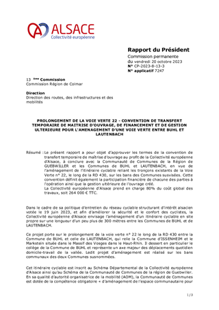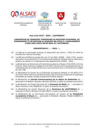 Le présent rapport a pour objet d’approuver les termes de la convention de transfert temporaire de maîtrise d’ouvrage au profit de la Collectivité européenne d’Alsace, à conclure avec la Communauté de Communes de la Région de GUEBWILLER et les Communes de BUHL et LAUTENBACH, en vue de l’aménagement de l’itinéraire cyclable reliant les tronçons existants de la Voie Verte n° 22, le long de la RD 430, sur les bans des Communes susvisées. Cette convention définit également la participation financière de chacune des parties à l'opération ainsi que la gestion ultérieure de l’ouvrage créé. La Collectivité européenne d’Alsace prend en charge 80% du coût global des travaux, soit 264 000 € TTC.