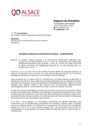 Le présent rapport propose à la Commission Permanente d'attribuer des subventions de fonctionnement pour la prise en charge des frais d'échanges amiables d'immeubles ruraux (articles L. 124-1 à L. 124-4-1 du Code rural et de la pêche maritime) aux bénéficiaires figurant sur la liste annexée pour un montant de 4 114 €.