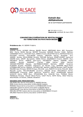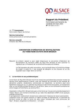 Le présent rapport a pour objet d’approuver la convention d'Opération de Revitalisation du Territoire (ORT) du Pays Rhin Brisach et d’en autoriser la signature par le Président de la Collectivité européenne d'Alsace. La CeA signataire de cette convention, sera impliquée dans le Comité de pilotage du projet. A cette fin, il est proposé de désigner un élu titulaire et un élu suppléant pour siéger dans ce Comité.