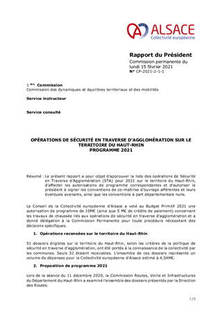 Le présent rapport a pour objet d’approuver la liste des opérations de Sécurité en Traverse d’Agglomération (STA) pour 2021 sur le territoire du Haut-Rhin, d’affecter les autorisations de programme correspondantes et d’autoriser le président à signer les conventions de co-maîtrise d’ouvrage afférentes et leurs éventuels avenants, ainsi que les conventions à part départementale nulle.