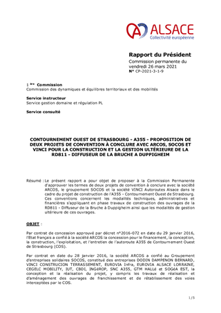 Le présent rapport a pour objet de proposer à la Commission Permanente d'approuver les termes de deux projets de convention à conclure avec la société ARCOS, le groupement SOCOS et la société VINCI Autoroutes Alsace dans le cadre du projet de construction de l'A355 - Contournement Ouest de Strasbourg. Ces conventions concernent les modalités techniques, administratives et financières s'appliquant en phase travaux de construction des ouvrages de la RD811 - Diffuseur de la Bruche à Duppigheim ainsi que les modalités de gestion ultérieure de ces ouvrages.