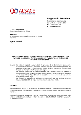 Le présent rapport a pour objet de proposer à la Commission permanente d'approuver le nouveau Protocole d’accord concernant le remboursement des avances consenties à l’établissement public du Port Rhénan de Colmar-Neuf-Brisach et d’autoriser le Président à le signer. Le premier protocole de remboursement est devenu caduc en raison de l’impossibilité pour le Syndicat Mixte Ouvert, aujourd’hui en charge de la gestion du Port de Colmar Neuf-Brisach de procéder au remboursement des sommes dues en décembre 2022. La Collectivité européenne d’Alsace est concernée par ce remboursement à hauteur de 926 197,12 € qui interviendra en décembre 2026.