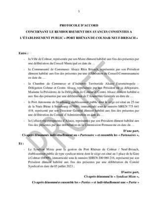 NOUVEAU PROTOCOLE D'ACCORD CONCERNANT LE REMBOURSEMENT DES AVANCES CONSENTIES À L'ÉTABLISSEMENT PUBLIC " PORT RHÉNAN DE COLMAR-NEUF-BRISACH "