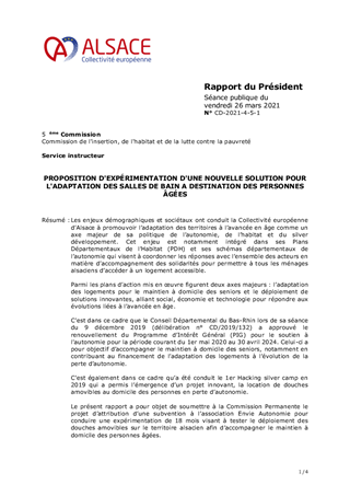 Les enjeux démographiques et sociétaux ont conduit la Collectivité européenne d’Alsace à promouvoir l’adaptation des territoires à l’avancée en âge comme un axe majeur de sa politique de l’autonomie, de l’habitat et du silver développement. Cet enjeu est notamment intégré dans ses Plans Départementaux de l’Habitat (PDH) et ses schémas départementaux de l’autonomie qui visent à coordonner les réponses avec l’ensemble des acteurs en matière d’accompagnement des solidarités pour permettre à tous les ménages alsaciens d’accéder à un logement accessible. Parmi les plans d’action mis en œuvre figurent deux axes majeurs : l’adaptation des logements pour le maintien à domicile des seniors et le déploiement de solutions innovantes, alliant social, économie et technologie pour répondre aux évolutions liées à l’avancée en âge. C’est dans ce cadre que le Conseil Départemental du Bas-Rhin lors de sa séance du 9 décembre 2019 (délibération n° CD/2019/132) a approuvé le renouvellement du Programme d’Intérêt Général (PIG) pour le soutien à l'autonomie pour la période courant du 1er mai 2020 au 30 avril 2024. Celui-ci a pour objectif d’accompagner le maintien à domicile des seniors, notamment en contribuant au financement de l’adaptation des logements à l’évolution de la perte d’autonomie. C’est également dans ce cadre qu’a été conduit le 1er Hacking silver camp en 2019 qui a permis l’émergence d’un projet innovant, la location de douches amovibles au domicile des personnes en perte d’autonomie. Le présent rapport a pour objet de soumettre à la Commission Permanente le projet d’attribution d’une subvention à l’association Envie Autonomie pour conduire une expérimentation de 18 mois visant à tester le déploiement des douches amovibles sur le territoire alsacien afin d’accompagner le maintien à domicile des personnes âgées.