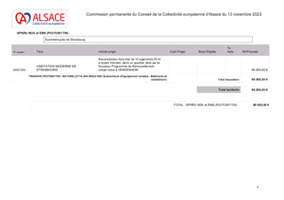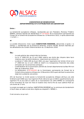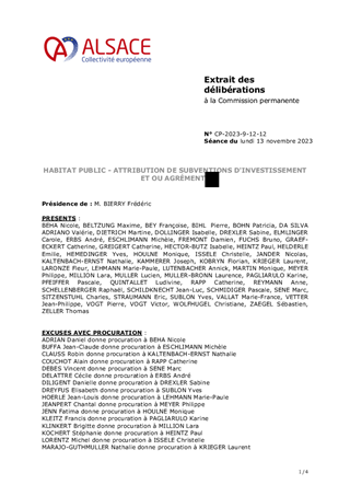 Le présent rapport a pour objet de proposer à la Commission permanente : I. d'approuver l'attribution de subventions d'investissement pour la construction de 12 logements à loyer minoré, à destination de ménages à faibles revenus (logements dits PLAI - Prêt Locatif Aidé d’Intégration) au titre du dispositif NPNRU et dans le cadre du Plan Départemental pour l’Habitat du Bas-Rhin, à HABITATION MODERNE pour un montant total de 96 000 €, de valider les conventions de subventionnement correspondantes et d’autoriser le Président à les signer II. d'approuver l'attribution de subventions d'investissement au titre de la politique volontariste de la Collectivité européenne d'Alsace pour la réhabilitation thermique de 34 logements locatifs sociaux dans le cadre de convention de partenariat avec la Banque des territoires, à ALSACE HABITAT pour un montant total de 45 380 €, de valider les conventions de subventionnement correspondantes et d’autoriser le Président à les signer