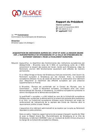 Aujourd’hui, la répartition des fonctionnaires des institutions européennes est déséquilibrée : Bruxelles (plus de 5 000) et Luxembourg (près de 2 000) concentrent la plupart des postes de travail, tandis qu’à Strasbourg, siège du Parlement, environ 300 fonctionnaires seulement sont affectés de manière permanente. Si un rééquilibrage en faveur de Strasbourg n’est pas enclenché, c’est l’avenir du Parlement européen à Strasbourg qui est menacé. Ainsi, la Collectivité européenne d’Alsace n’a eu de cesse de favoriser la construction d’un bâtiment pour rééquilibrer la répartition des effectifs européens par une présence supplémentaire en France. A Bruxelles, l’Europe est symbolisée par le Conseil de l’Europe, puis la Commission ... avant le Parlement européen, privilégiant ainsi une vision technocratique de l’Europe. A Strasbourg, la présence européenne symbolise le centre névralgique de la démocratie européenne. Le qualificatif « européen » a été intégré au nom de la Collectivité européenne d’Alsace pour symboliser la démocratie et la collectivité souhaite être exemplaire à ce titre. La Collectivité européenne d’Alsace porte fortement cet enjeu de renforcement de l’attractivité de la capitale des Droits de l’Homme dont le rayonnement profite à toute l’Alsace. L’acquisition d’un bâtiment administratif et sa location par la suite au Parlement répondent à cette ambition. Dans ce cadre, l’objet du rapport est ainsi de proposer d'acquérir auprès de l'Etat et avec la Région Grand Est, l'Eurométropole de Strasbourg et la Ville de Strasbourg, le bâtiment OSMOSE I pour un montant de 8,025 millions d'euros à la charge de la Collectivité européenne d'Alsace.