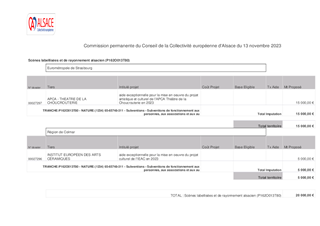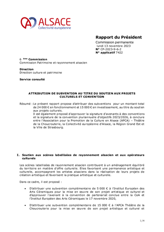 Le présent rapport propose d’attribuer des subventions pour un montant total de 24 000 € en fonctionnement et 15 000 € en investissement, au titre du soutien aux projets culturels. Il est également proposé d'approuver la signature d'avenants à des conventions et la signature de la convention pluriannuelle d’objectifs 2023/2026, à conclure entre l’Association pour la Promotion de la Culture en Alsace (APCA) – Théâtre de la Choucrouterie, la Collectivité européenne d’Alsace, la Région Grand Est et la Ville de Strasbourg.