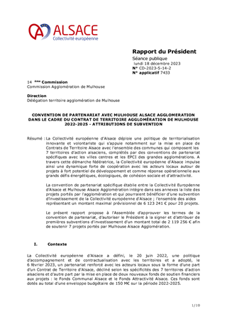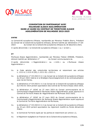 La Collectivité européenne d’Alsace déploie une politique de territorialisation innovante et volontariste qui s’appuie notamment sur la mise en place de Contrats de Territoire Alsace avec l’ensemble des communes qui composent les 7 territoires d’action alsaciens, complétés par des conventions de partenariat spécifiques avec les villes centres et les EPCI des grandes agglomérations. A travers cette démarche fédératrice, la Collectivité européenne d’Alsace impulse ainsi une dynamique forte de coopération avec les acteurs locaux autour de projets à fort potentiel de développement et comme réponse opérationnelle aux grands défis énergétiques, écologiques, de cohésion sociale et d’attractivité. La convention de partenariat spécifique établie entre la Collectivité Européenne d’Alsace et Mulhouse Alsace Agglomération intègre dans ses annexes la liste des projets portés par l'agglomération et qui pourraient bénéficier d'une subvention d’investissement de la Collectivité européenne d'Alsace ; l’ensemble des aides représentant un montant maximal prévisionnel de 6 123 241 € pour 20 projets. Le présent rapport propose à l’Assemblée d’approuver les termes de la convention de partenariat, d’autoriser le Président à la signer et d'attribuer de premières subventions d'investissement d'un montant total de 2 119 256 € afin de soutenir 7 projets portés par Mulhouse Alsace Agglomération.