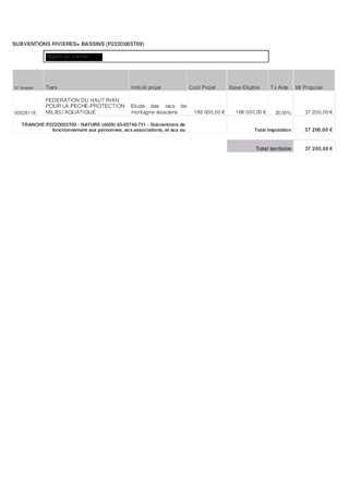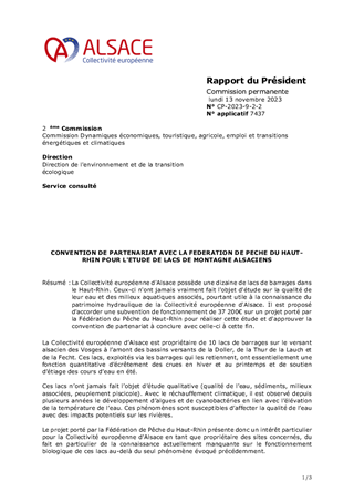 La Collectivité européenne d'Alsace possède une dizaine de lacs de barrages dans le Haut-Rhin. Ceux-ci n'ont jamais vraiment fait l'objet d'étude sur la qualité de leur eau et des milieux aquatiques associés, pourtant utile à la connaissance du patrimoine hydraulique de la Collectivité européenne d'Alsace. Il est proposé d'accorder une subvention de fonctionnement de 37 200€ sur un projet porté par la Fédération du Pêche du Haut-Rhin pour réaliser cette étude et d'approuver la convention de partenariat à conclure avec celle-ci à cette fin.