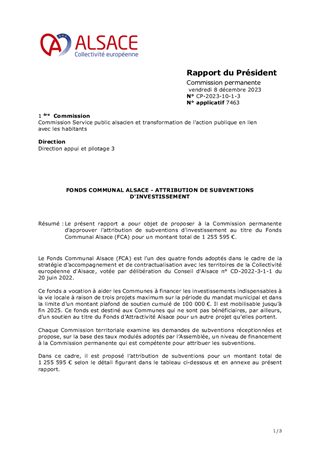 Le présent rapport a pour objet de proposer à la Commission permanente d'approuver l'attribution de subventions d'investissement au titre du Fonds Communal Alsace (FCA) pour un montant total de 1 255 595 €.