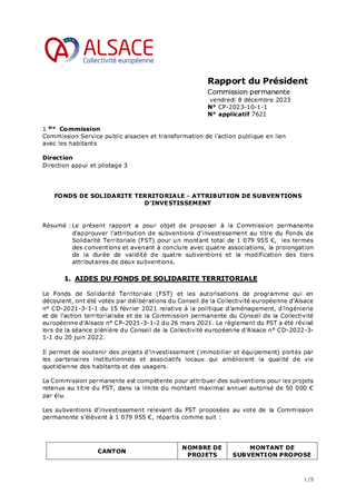 Le présent rapport a pour objet de proposer à la Commission permanente d'approuver l'attribution de subventions d'investissement au titre du Fonds de Solidarité Territoriale (FST) pour un montant total de 1 079 955 €, les termes des conventions et avenant à conclure avec quatre associations, la prolongation de la durée de validité de quatre subventions et la modification des tiers attributaires de deux subventions.