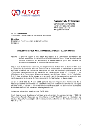 Le présent rapport a pour objet de proposer à la Commission permanente de décider d'attribuer une subvention d'investissement de 17 528 € à l'Association Foncière Pastorale du Kinschberg à SAINT-MARTIN pour des travaux de réouverture paysagère et de restauration pastorale.