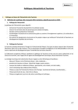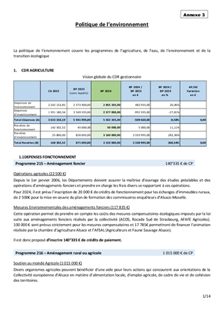 Pour ce budget 2024, la conjoncture internationale reste très instable et continue à faire peser sur notre économie de lourdes contraintes, qui s’accumulent tels que le renchérissement des coûts de l’énergie, le niveau d’inflation élevé, l’augmentation des taux d’intérêt des prêts bancaires, la hausse des défaillances des entreprises, la pénurie de main d’œuvre, la stagnation de l’emploi salarié et la baisse du pouvoir d’achat des ménages. C’est dans ce contexte dégradé aux perspectives incertaines que l’action globale de la Collectivité européenne d’Alsace, acteur majeur et unique des solidarités humaines et territoriales, prend encore plus de sens et d’ampleur. Avec comme boussole la proximité, la seule clé efficace pour répondre aux nombreux défis d’avenir, la Collectivité européenne d’Alsace répond présente à travers ses différentes priorités déclinées en autant d’axes stratégiques au service de l’attractivité, de l’économie locale, des acteurs et des partenaires et avec la meilleure efficacité budgétaire. Cela veut dire soutenir durablement la relance économique et continuer à relever ces défis qui nous engagent tous : la compétitivité, la cohésion sociale, la transition écologique et numérique, l’innovation, la sobriété foncière afin d’accompagner une dynamique de croissance et de création d’emplois. Un axe fort qui consiste à accompagner les projets structurants qui renforcent l’attractivité de nos territoires (soutien aux ports et aéroports d’Alsace, projet d’aménagement "3Land", soutien à l’immobilier d’entreprises). En matière d’attractivité, la Collectivité européenne d’Alsace a pour ambition d’assurer un développement de l’économie de proximité et du tourisme durable, résilient et solidaire, qui s’inscrit dans l’espace transfrontalier du Rhin supérieur avec un renforcement de la coopération des acteurs publics et privés et un ancrage territorial dynamisé par la puissance de la Marque Alsace. En matière de tourisme, la Collectivité européenne d’Alsace continue de s’appuyer sur les grandes filières d’excellence de la Destination Alsace et de les valoriser (Alsace à vélo, Châteaux et cités fortifiés, gastronomie, tourisme de mémoire, montagne, bien-être,….) tout en s’adaptant aux nouveaux enjeux et en conciliant la qualité de vie des habitants avec les attentes des touristes : l’écotourisme, le « slow tourisme » et le tourisme régénératif, la mobilité des personnes, l’intermodalité, la répartition des fréquentations, la recherche d’authenticité, le tourisme social et solidaire, un tourisme moteur de l’économie locale,… Protéger notre environnement et répondre aux enjeux énergétiques est une nécessité car c’est l’affaire de tous. En la matière, la Collectivité européenne d’Alsace porte une forte ambition dans sa stratégie énergétique et écologique « 30 engagements pour 2030 » adoptée le 13 novembre 2023. La politique de l’eau conduite par la Collectivité est la colonne vertébrale de son engagement pour la résilience de l’Alsace face au dérèglement climatique, en veillant à la préservation qualitative et quantitative de la ressource en eau. La stratégie alsacienne des Espaces Naturels Sensibles, ensuite, fonde l’implication de la Collectivité dans la préservation de la biodiversité et des milieux, s’appuyant à la fois sur un effort considérable pour soutenir l’éducation à l’environnement et le déploiement de la Brigade Verte. Enfin, le soutien à l’agriculture et la forêt alsaciennes est guidé par la conviction de la complémentarité entre leur fonction économique et leur rôle dans la qualité de vie des Alsaciens. Le Budget Primitif 2024 relatif aux dynamiques économiques, touristique, agricole, à l’emploi et aux transitions énergétiques et climatiques déclinera ces grandes ambitions avec une gestion rigoureuse des dépenses. Pour la politique de l’attractivité, il est proposé d’inscrire un crédit de paiement à hauteur de 5 411 580 € en dépenses. Pour la politique du tourisme, il est proposé d’inscrire un crédit de paiement à hauteur de 5 555 976 € en dépenses et une recette de 700 000 €. Pour la politique de l’environnement, il est proposé d’inscrire un crédit de paiement à hauteur de 16 912 975 € en dépenses et une recette de 38 390 000 €
