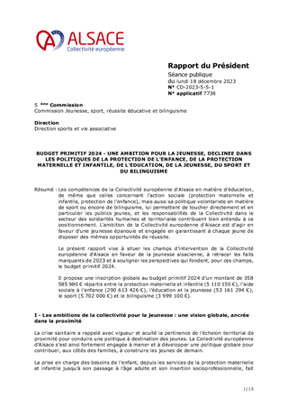 Les compétences de la Collectivité européenne d’Alsace en matière d’éducation, de même que celles concernant l’action sociale (protection maternelle et infantile, protection de l’enfance), mais aussi sa politique volontariste en matière de sport ou encore de bilinguisme, lui permettent de toucher directement et en particulier les publics jeunes, et les responsabilités de la Collectivité dans le secteur des solidarités humaines et territoriales contribuent bien entendu à ce positionnement. L'ambition de la Collectivité européenne d'Alsace est d'agir en faveur d'une jeunesse épanouie et engagée en garantissant à chaque jeune de disposer des mêmes opportunités de réussite. Le présent rapport vise à situer les champs d’intervention de la Collectivité européenne d'Alsace en faveur de la jeunesse alsacienne, à retracer les faits marquants de 2023 et à souligner les perspectives qui fondent, pour ces champs, le budget primitif 2024. Il propose une inscription globale au budget primitif 2024 d'un montant de 358 585 980 € répartis entre la protection maternelle et infantile (5 110 150 €), l’aide sociale à l’enfance (290 613 426 €), l’éducation et la jeunesse (53 161 294 €), le sport (5 702 000 €) et le bilinguisme (3 999 100 €).