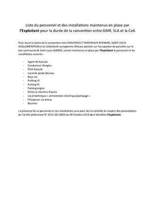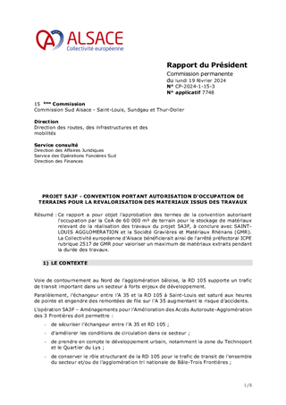Ce rapport a pour objet l'approbation des termes de la convention autorisant l'occupation par la CeA de 60 000 m² de terrain pour le stockage de matériaux relevant de la réalisation des travaux du projet 5A3F, à conclure avec SAINT-LOUIS AGGLOMERATION et la Société Gravières et Matériaux Rhénans (GMR). La Collectivité européenne d'Alsace bénéficierait ainsi de l'arrêté préfectoral ICPE rubrique 2517 de GMR pour valoriser un maximum de matériaux extraits pendant la durée des travaux.