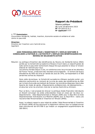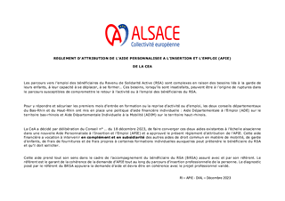 La politique d’insertion des bénéficiaires du Revenu de Solidarité Active (RSA) portée par la Collectivité européenne d’Alsace s’inscrit dans un objectif global de lutte contre la pauvreté recherchant chaque fois que possible le retour à l’emploi d’abord et l’activité pour tous. Les actions menées depuis 3 ans, en cohérence avec les principes et les attendus de France Travail, produisent des résultats encourageants : le nombre de foyers allocataires du RSA est ainsi en baisse de plus de 14%, correspondant à 6 500 personnes sorties du dispositif. Dans cette dynamique, la Collectivité européenne d’Alsace souhaite porter une attention particulière au moment de la prise de poste des bénéficiaires du RSA par le biais d’une aide permettant de financer les premières dépenses liées à des besoins de mode de garde, d’équipements professionnels, de déplacements,…. et sécuriser ainsi les premiers mois de la reprise d’activité ou d’emploi. Pour ce faire, il est proposé de rénover la politique d’aide financière individuelle en faisant converger les aides préexistantes mises en place par les deux ex-Départements : Aide Départementale à l’Emploi (ADE) pour le Bas-Rhin et Aide Départementale Individuelle à la Mobilité (ADIM) pour le Haut-Rhin - dans une nouvelle Aide Personnalisée à l’Insertion et l’Emploi (APIE). Aussi, le présent rapport a pour objet de valider l’Aide Personnalisée à l’Insertion et l’Emploi (APIE) et d’en approuver le règlement intérieur pour un budget annuel total prévisionnel de 670 000 € qui traduit un engagement supplémentaire de 300 000 €.