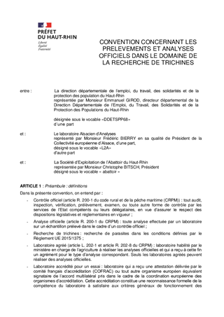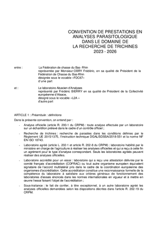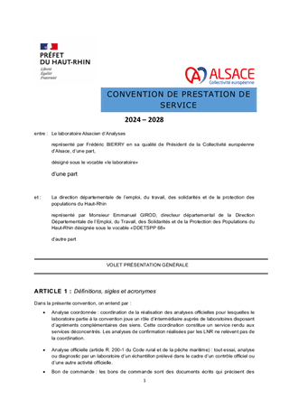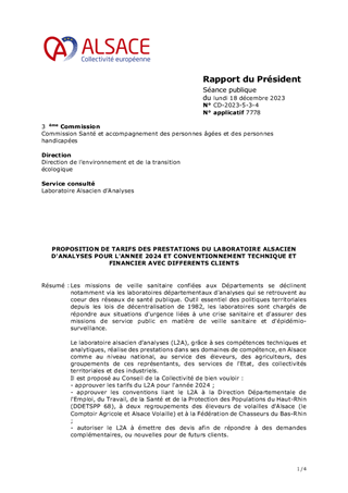 Les missions de veille sanitaire confiées aux Départements se déclinent notamment via les laboratoires départementaux d'analyses qui se retrouvent au coeur des réseaux de santé publique. Outil essentiel des politiques territoriales depuis les lois de décentralisation de 1982, les laboratoires sont chargés de répondre aux situations d'urgence liées à une crise sanitaire et d'assurer des missions de service public en matière de veille sanitaire et d'épidémio-surveillance. Le laboratoire alsacien d'analyses (L2A), grâce à ses compétences techniques et analytiques, réalise des prestations dans ses domaines de compétence, en Alsace comme au niveau national, au service des éleveurs, des agriculteurs, des groupements de ces représentants, des services de l'Etat, des collectivités territoriales et des industriels. Il est proposé au Conseil de la Collectivité de bien vouloir : - approuver les tarifs du L2A pour l'année 2024 ; - approuver les conventions liant le L2A à la Direction Départementale de l'Emploi, du Travail, de la Santé et de la Protection des Populations du Haut-Rhin (DDETSPP 68), à deux regroupements des éleveurs de volailles d'Alsace (le Comptoir Agricole et Alsace Volaille) et à la Fédération de Chasseurs du Bas-Rhin ; - autoriser le L2A à émettre des devis afin de répondre à des demandes complémentaires, ou nouvelles pour de futurs clients.