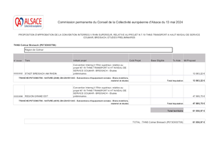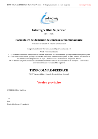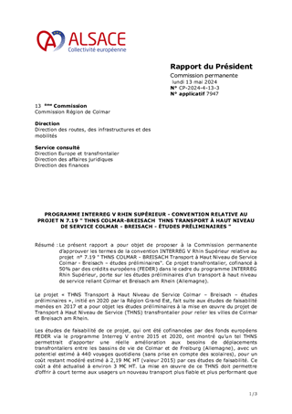 Le présent rapport a pour objet de proposer à la Commission permanente d’approuver les termes de la convention INTERREG V Rhin Supérieur relative au projet n° 7.19 " THNS COLMAR - BREISACH Transport à Haut Niveau de Service Colmar - Breisach – études préliminaires". Ce projet transfrontalier, cofinancé à 50% par des crédits européens (FEDER) dans le cadre du programme INTERREG Rhin Supérieur, porte sur les études préliminaires d'un transport à haut niveau de service reliant Colmar et Breisach am Rhein (Allemagne).