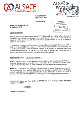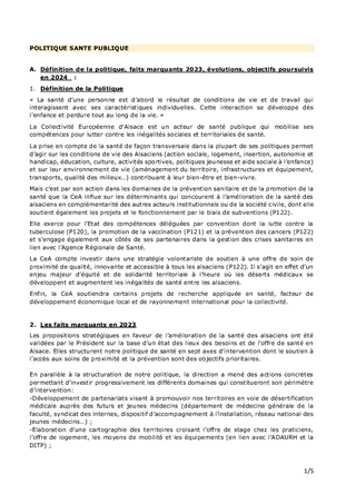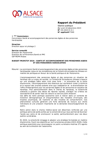 La commission Santé et accompagnement des personnes âgées et des personnes handicapées recouvre les compétences de la Collectivité européenne d'Alsace en matière de politiques en faveur de la Santé publique et de l'Autonomie. L’accompagnement des personnes âgées et des personnes en situation de handicap est un enjeu de société. La Collectivité Européenne d’Alsace s’appuie sur une stratégie bâtie selon trois axes forts : la prévention de la perte d’autonomie, l’accompagnement des Alsaciens qui souhaitent rester à domicile et le soutien des proches aidants ainsi que l’adaptation et la diversification de l’offre d’hébergement pour les personnes âgées et les personnes en situation de handicap. Plus particulièrement dans le champ du handicap, la Collectivité s’attache à garantir des délais de réponse rapides, d’alléger les critères de recevabilité et de porter haut les valeurs su service public Alsacien. Ces défis de notre politique autonomie sont à relever dans un contexte de transition démographique et d’augmentation des maladies chroniques, des troubles psychiques, de l’autisme et des troubles de comportement. Ces phénomènes cumulés génèrent une forte demande de recours aux droits individuels et une pression importante de la demande d’accompagnement du public. Notre action dans le champ médico-social est désormais renforcée par une politique active de santé portée par la collectivité et qui nous permet de favoriser l’accès aux soins et de promouvoir la santé, particulièrement pour ces deux publics vulnérables. En 2024, la collectivité s’engage à adopter une stratégie formalisée en matière d’autonomie, fixant nos objectifs sur les 5 prochaines années (2024-2028). Cette politique essentielle pour accompagner ce public vulnérable mobilise 271 agents au sein de la direction de l’autonomie. En outre, notre politique de Santé publique se décline au service de la santé des Alsaciens au plus proche de nos territoires, de la mise en œuvre d’actions volontaristes de lutte contre les inégalités sociales et territoriales de santé (lutte contre la désertification médicale, offre de soins pour les publics vulnérables) à l’exercice de compétences déléguées de l’Etat (lutte contre la tuberculose, promotion de la vaccination, prévention des cancers) et au soutien aux territoires par son investissement dans les contrats locaux de santé et médicosociaux. Notre Collectivité contribue à de nombreuses actions de prévention sanitaire via le soutien financier déterminé au milieu associatif. Elle s’engage également aux côtés de ses partenaires dans la gestion des crises sanitaires en lien avec l’Agence Régionale de Santé. La coopération transfrontalière en santé est depuis peu, un nouvel axe de développement d’action, notamment dans le cadre de Schéma Alsacien de Coopération Transfrontalière. Le présent rapport a pour ambition de définir les moyens budgétaires dédiés aux actions en faveur de la santé et de l'accompagnement des personnes âgées et des personnes handicapées, de retracer les faits marquants de 2023, et de tracer les perspectives qui fondent le budget primitif 2024. Il propose une inscription globale, pour les directions composant la 3e commission de 509,7 M€ de dépenses et 141,4 M€ de recettes, se répartissant entre : - la politique de l’Autonomie : 498,4 M€ en dépenses (+7,3 M€) et 138,5 M€ en recettes (-1,1 M€) de fonctionnement, et 7,1 M€ en dépenses (+1,4 M€) d’investissement ; - la politique de la Santé publique : 2,8 M€ en dépenses (+1,6 M€) et 2,9 M€ en recettes (+1,1 M€) de fonctionnement, et 1,4 M€ en dépenses (+280 K€) d’investissement.