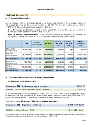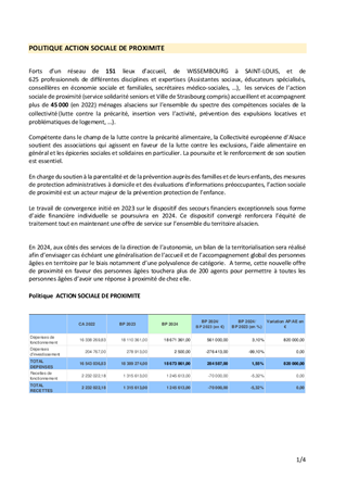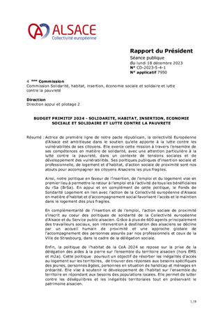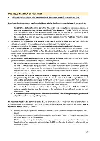 Actrice de première ligne de notre pacte républicain, la collectivité Européenne d’Alsace est ambitieuse dans le soutien qu’elle apporte à la lutte contre les vulnérabilités de ses citoyens. Elle exerce cette mission à travers l’ensemble de ses compétences en matière de solidarité, avec une attention particulière à la lutte contre la pauvreté, dans un contexte de tensions sociales et de développement des vulnérabilités. Ses politiques publiques d’insertion sociale et professionnelle, de logement et d’habitat, d’action sociale de proximité sont nos atouts pour accompagner les citoyens Alsaciens les plus fragiles. Ainsi, notre politique en faveur de l’insertion, de l’emploi et du logement vise en premier lieu à permettre le retour à l’emploi et à l’activité de tous les bénéficiaires du rSa (BrSa). En appui et en complément de cette politique, le Fonds de Solidarité Logement en lien avec l’action de la Collectivité européenne d’Alsace en matière d’habitat et d’accompagnement social favorisent l’accès et le maintien dans le logement des plus fragiles. En complémentarité de l’insertion et de l’emploi, l’action sociale de proximité s’inscrit au coeur des politiques de solidarité de la Collectivité européenne d’Alsace et du Service public alsacien. Grâce à plus de 600 agents principalement des travailleurs sociaux, son intervention à destination des alsaciens se décline par un accueil humain de proximité et une approche globale de l’accompagnement des personnes assurés par nos professionnels et ceux de la Ville de Strasbourg, dans le cadre de la délégation sociale. Enfin, la politique de l’habitat de la CeA 2024 se repose sur la prise de la délégation des aides à la pierre sur l’ensemble du territoire alsacien (hors EMS et m2a). Cette politique poursuit un objectif de résorber les inégalités d’accès au logement sur les territoires, de trouver des réponses aux besoins spécifiques des jeunes, personnes âgées, personnes en situation de handicap et ménages en précarité. Elle vise à soutenir le développement de l’habitat sur l’ensemble du territoire en répondant aux besoins des populations locales. Elle permet de lutter contre les déséquilibres et les inégalités territoriales tout en préservant le patrimoine alsacien. Le présent rapport a pour ambition de définir les moyens budgétaires dédiés principalement aux actions en faveur de la lutte contre la pauvreté, de l’insertion, de l’emploi, du logement et de l’habitat, de retracer les faits marquants de 2023, et de tracer les perspectives qui fondent le budget primitif 2024 Il propose une inscription globale, pour les directions composant la 4e commission de 344 640 453 € de dépenses et 147 443 413 € de recettes, se répartissant entre : • La politique insertion et logement : il est proposé d’inscrire 300,4 M€ en dépenses (+0,7 M€) et 129,9 M€ en recettes (-2,3 M€) de fonctionnement, et 41 K€ en dépenses (+11 K€) d’investissement. • La politique de l’Action sociale de proximité : il est proposé d’inscrire 18,7 M€ en dépenses (+0,5 M€) et 1,25 M€ en recettes (-70 K€) de fonctionnement, et 2,5 K€ en dépenses (-276 K€) d'investissement. • La politique de l’Habitat : il est proposé d’inscrire 5,5 M€ en dépenses (-58 K€) et 1,6 M€ en recettes (+16 K€) de fonctionnement, et 20 M€ en dépenses (+5 M€) et 14,6 M€ en recettes (+2,2 M€) d’investissement.