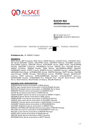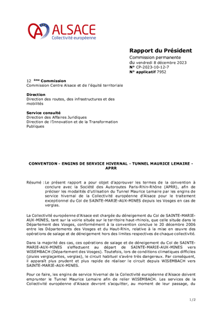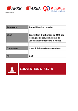 Le présent rapport a pour objet d'approuver les termes de la convention à conclure avec la Société des Autoroutes Paris-Rhin-Rhône (APRR), afin de préciser les modalités d'utilisation du Tunnel Maurice Lemaire par les engins de service hivernal de la Collectivité européenne d’Alsace pour le traitement exceptionnel du Col de SAINTE-MARIE-AUX-MINES depuis les Vosges en cas de verglas.