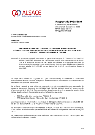 Il vous est proposé d’accorder la garantie d'emprunt à COOPERATIVE CENTRE ALSACE HABITAT à hauteur de 100 % pour un prêt d’un montant total de 1 001 310 € à souscrire auprès de la Caisse des Dépôts et Consignations pour le financement d'une opération de réhabilitation thermique de 56 logements locatifs sociaux situés 51-53-55-57 rue du Ladhof et 1-3-5-7 rue Chanoine Boxler à COLMAR.